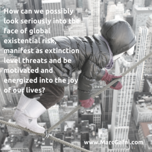 How can we possibly look seriously into the face of global existential risk, manifest as extinction level threats and be motivated and energized into the joy of our lives?