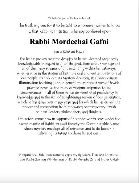 Rabbinic Ordination Rabbi Marc Gafni by Rabbi Gershon Wrinkler [Semichah hebrew]